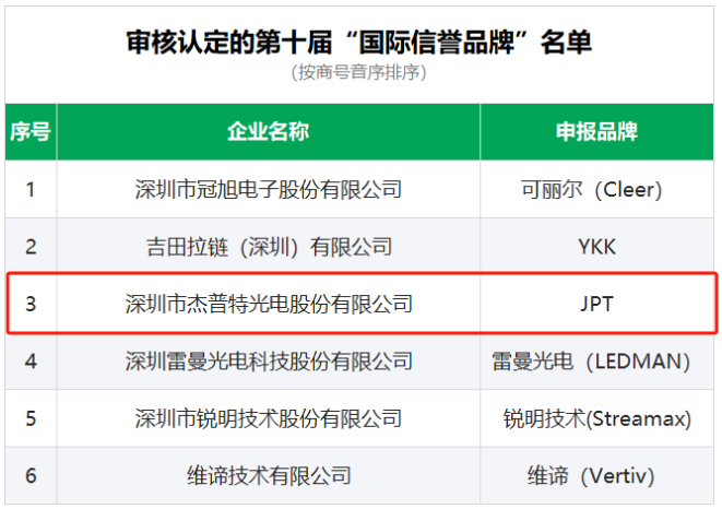為提升中國優秀品牌的國際影響力,持續推進品牌國際化,經第三方機構--聯合國工業發展組織中國南南工業合作中心對評選方式和公正性審核確認,深圳知名品牌評價委員會與聯合國工業發展組織認定并發布十屆“國際譽品牌”。經深圳知名品牌評價委員會全體會議審議審核認定深圳市杰普特光電股份有限公司“JPT”品牌為第十屆“國際信譽品牌”,2024年5月9日召開“第八屆深圳(灣區)國際品牌周開幕大會”,對“國際信譽品牌”進行頒獎。