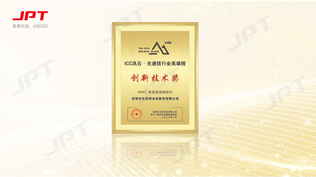 2026年1月16日,備受行業矚目的 IFOC 訊石光通信大會?年度論壇暨 2025 “訊石英雄榜” 頒獎典禮在東莞圓滿落幕。深圳市杰普特光電股份有限公司(股票代碼:688025)憑工藝優化升級 MMC 高密度線纜組件,從眾多參評產品中脫穎而出,成功摘得 “創新技術獎”,彰顯了在光互聯領域的硬核技術實力與行業認可度。