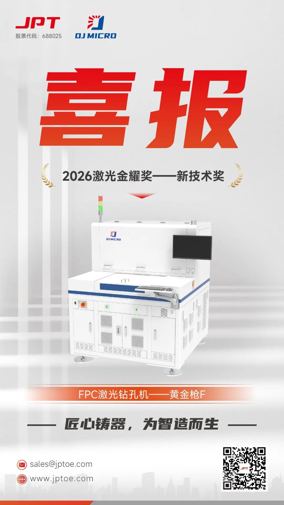 3月17日,"2026 激光金耀獎(GLA)" 頒獎典禮在上海隆重舉行。杰普特FPC激光鉆孔機 —— 黃金槍F,憑借在柔性電路板加工領域的突破性技術與行業領先性能,成功榮獲 "2026 激光金耀獎 —— 新技術獎"。