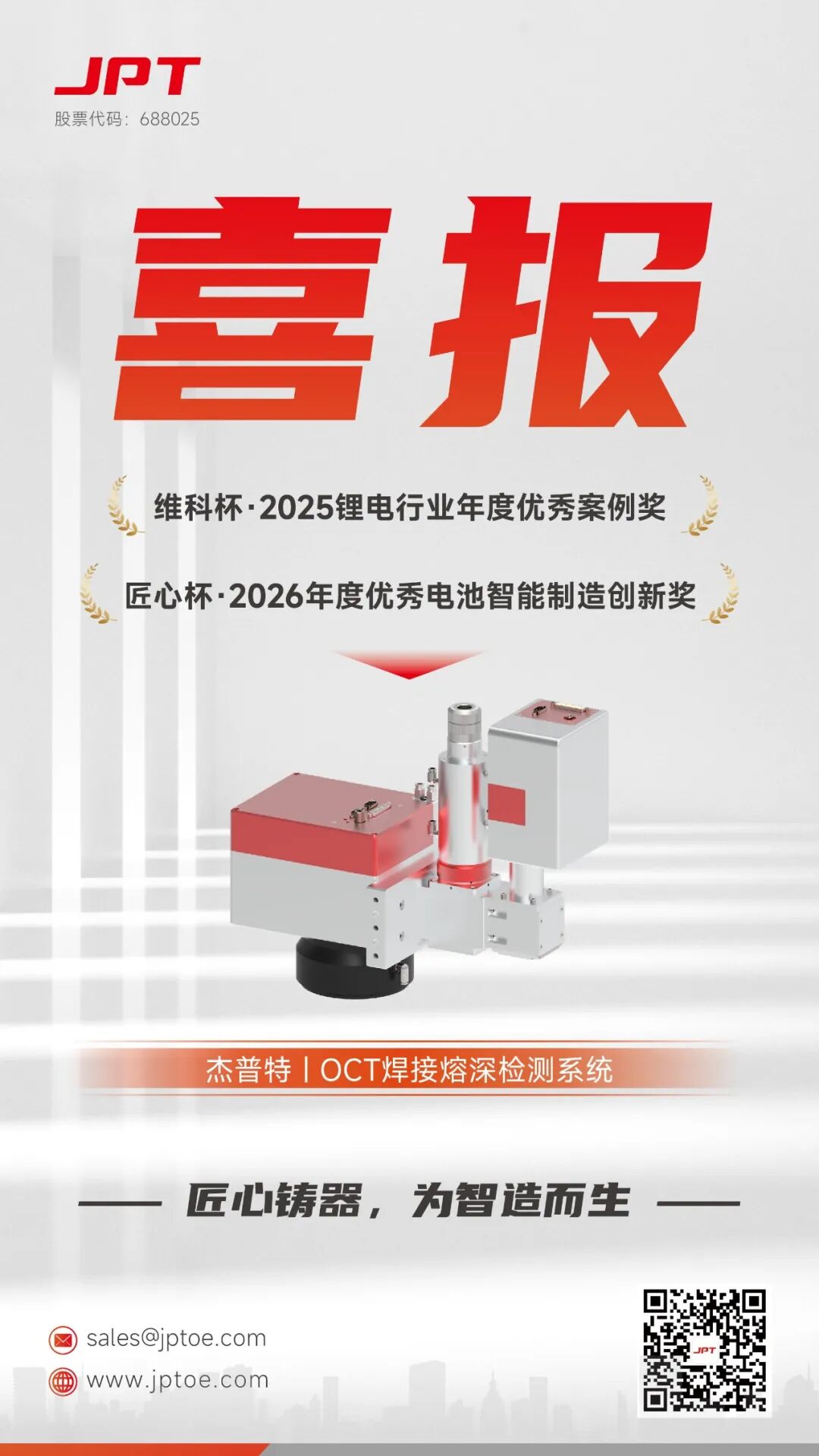 3月12日,杰普特OCT焊接熔深檢測系統在“維科杯·OFweek 2025鋰電行業年度頒獎典禮”及同日舉辦的 “電池工匠年會2026”上榮獲“維科杯·2025鋰電行業年度優秀案例獎”及“匠心杯·2026年度優秀電池智造創新獎”,兩項榮譽肯定了杰普特在鋰電行業的優秀成果,彰顯杰普特在激光焊接過程監測的硬核實力。